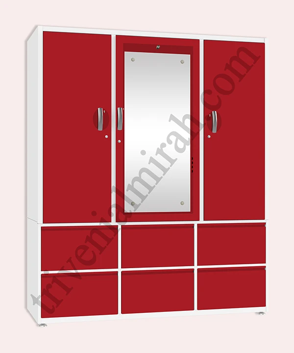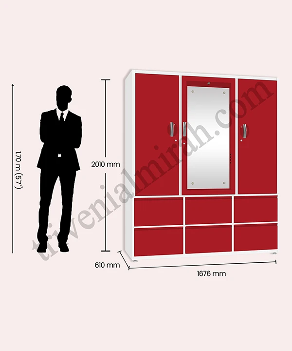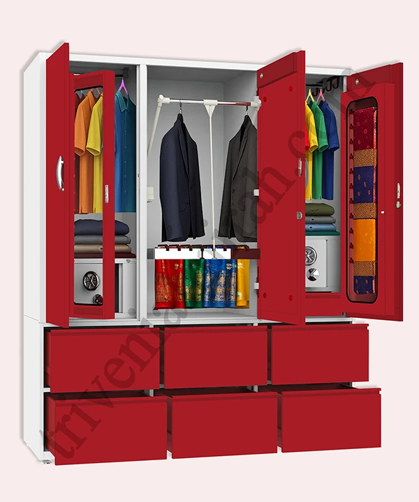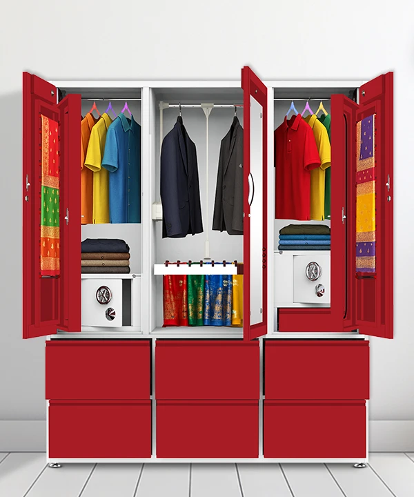 Step into a world where style meets structure. This vibrant maroon and white wardrobe is designed for those who value both aesthetics and functionality. With a secure built-in safe, spacious drawers, and a playful mix of colorful hangers, it’s more than just storage—it’s a statement.