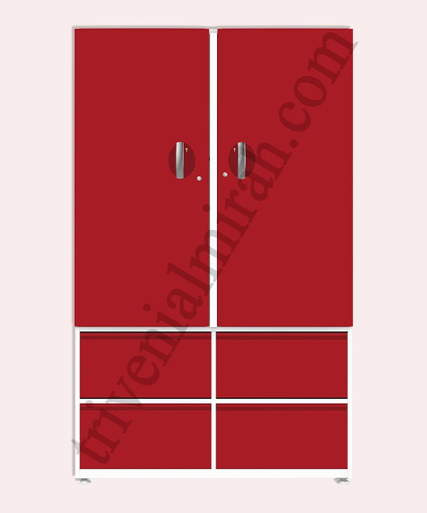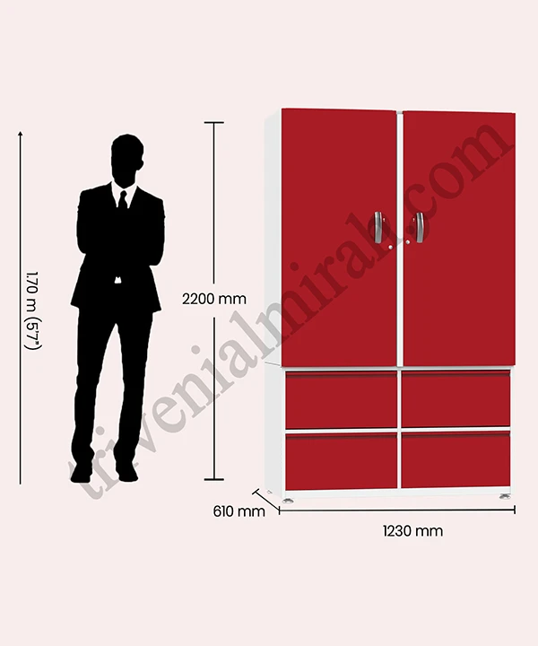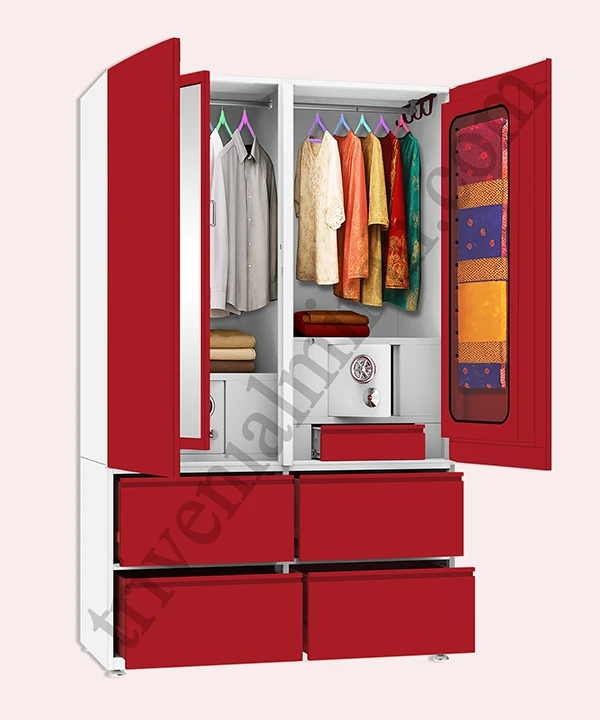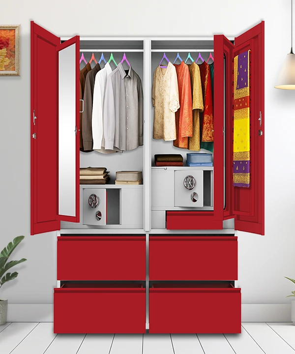 Step into a world where style meets structure. This vibrant red and white wardrobe is designed for those who value both aesthetics and functionality. With a secure built-in safe, spacious drawers, and a playful mix of colorful hangers, it’s more than just storage—it’s a statement.