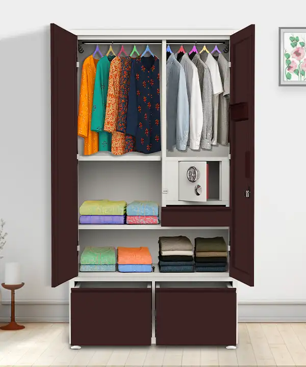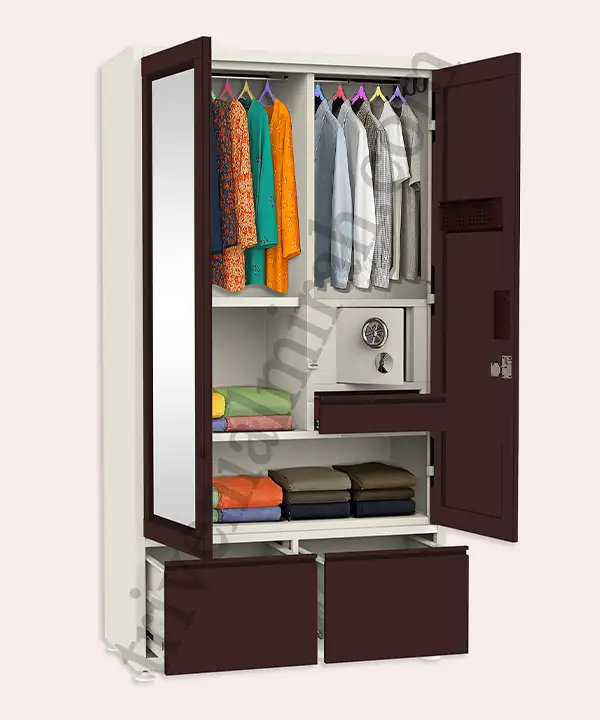 Step into a world where style meets structure. This vibrant coffee and white wardrobe is designed for those who value both aesthetics and functionality. With a secure built-in safe, spacious drawers, and a playful mix of colorful hangers, it’s more than just storage—it’s a statement.