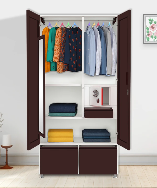 The built-in mirror adds a touch of sophistication while serving everyday practicality. Framed in a bold accent color, it enhances the wardrobe’s visual appeal and offers a convenient solution for quick styling checks. Thoughtfully positioned inside the door, it maximizes space without compromising design—making it a perfect blend of elegance and efficiency.