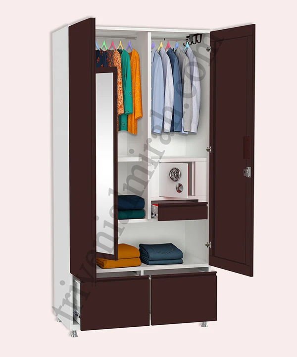 Step into a world where style meets structure. This vibrant Coka and white wardrobe is designed for those who value both aesthetics and functionality. With a secure built-in safe, spacious drawers, and a playful mix of colorful hangers, it’s more than just storage—it’s a statement.