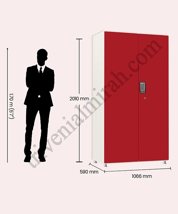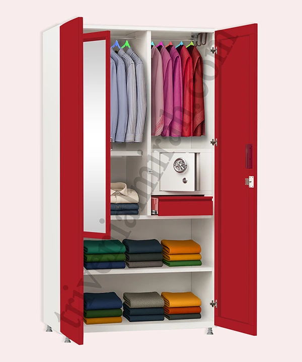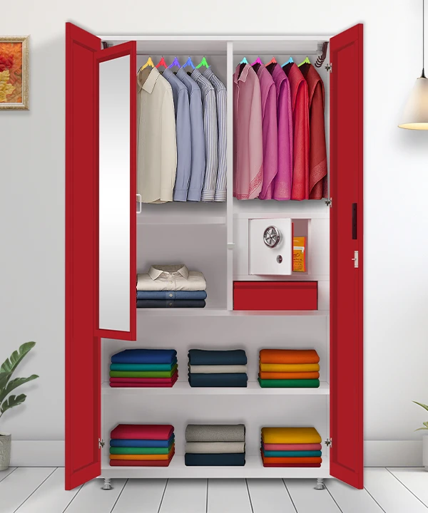 Step into a world where style meets structure. This vibrant red and white wardrobe is designed for those who value both aesthetics and functionality. With a secure built-in safe, spacious drawers, and a playful mix of colorful hangers, it’s more than just storage—it’s a statement.