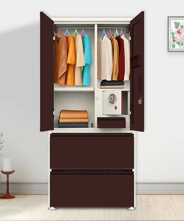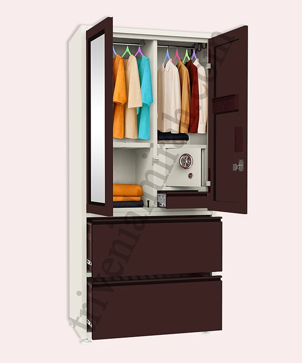 Step into a world where style meets structure. This vibrant coffee and white wardrobe is designed for those who value both aesthetics and functionality. With a secure built-in safe, spacious drawers, and a playful mix of colorful hangers, it’s more than just storage—it’s a statement.
