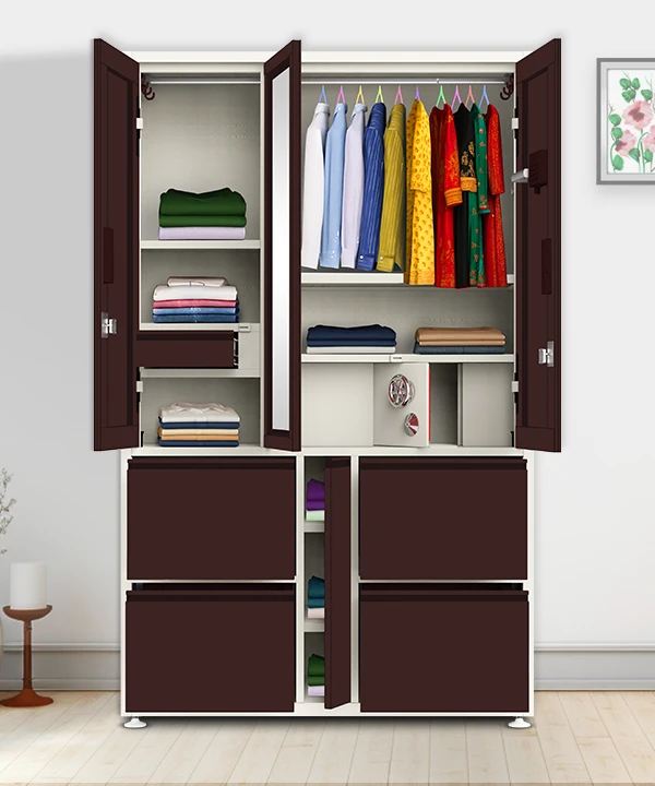 Step into a world where style meets structure. This vibrant coffee and white wardrobe is designed for those who value both aesthetics and functionality. With a secure built-in safe, spacious drawers, and a playful mix of colorful hangers, it’s more than just storage—it’s a statement.