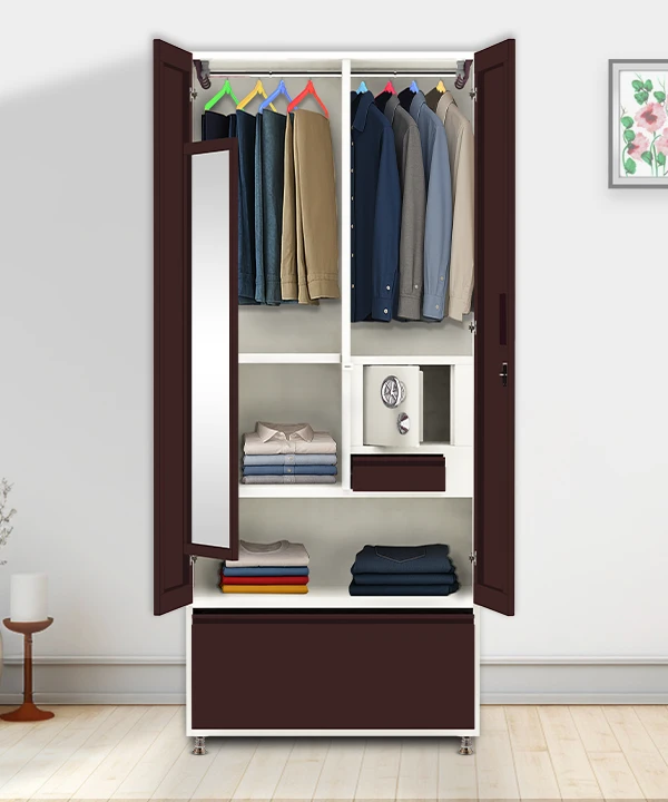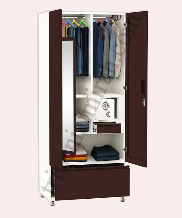The built-in mirror adds a touch of sophistication while serving everyday practicality. Framed in a bold accent color, it enhances the wardrobe’s visual appeal and offers a convenient solution for quick styling checks. Thoughtfully positioned inside the door, it maximizes space without compromising design—making it a perfect blend of elegance and efficiency.