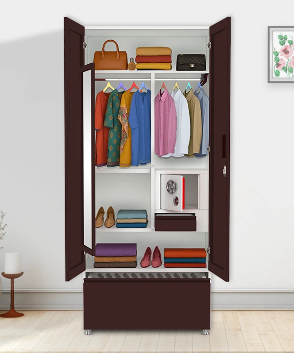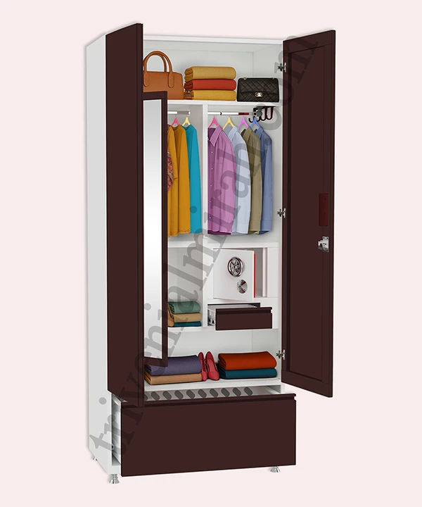 Step into a world where style meets structure. This vibrant Coka and white wardrobe is designed for those who value both aesthetics and functionality. With a secure built-in safe, spacious drawers, and a playful mix of colorful hangers, it’s more than just storage—it’s a statement.