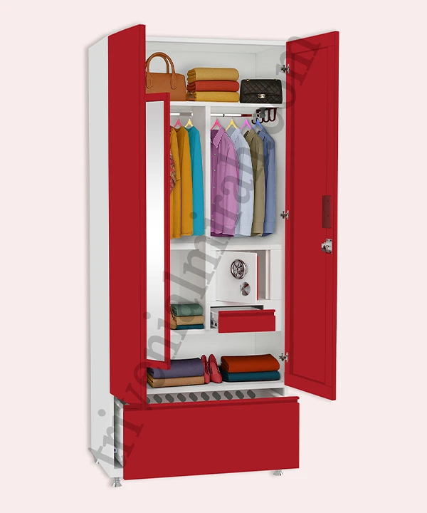 Step into a world where style meets structure. This vibrant red and white wardrobe is designed for those who value both aesthetics and functionality. With a secure built-in safe, spacious drawers, and a playful mix of colorful hangers, it’s more than just storage—it’s a statement.