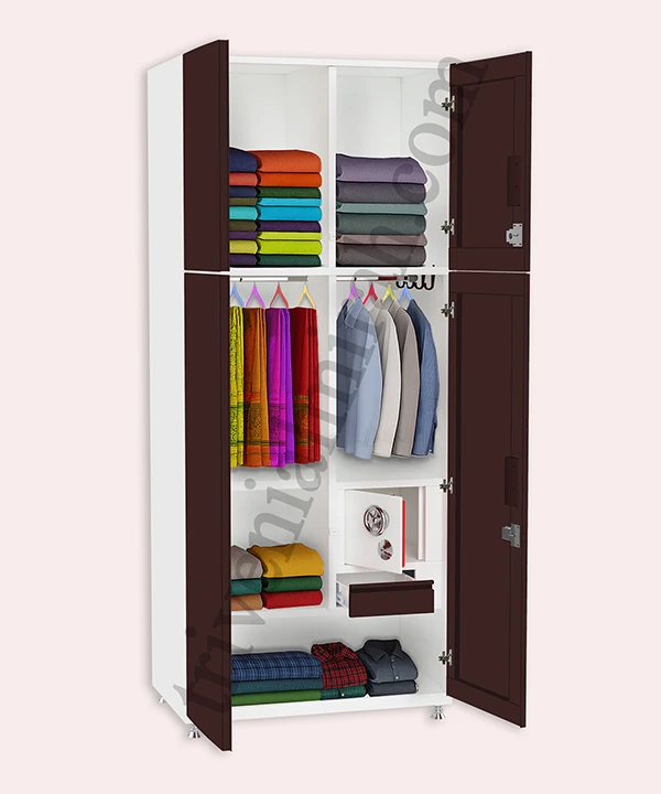 Step into a world where style meets structure. This vibrant coka and white wardrobe is designed for those who value both aesthetics and functionality. With a secure built-in safe, spacious drawers, and a playful mix of colorful hangers, it’s more than just storage—it’s a statement.